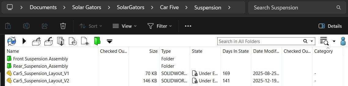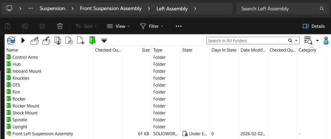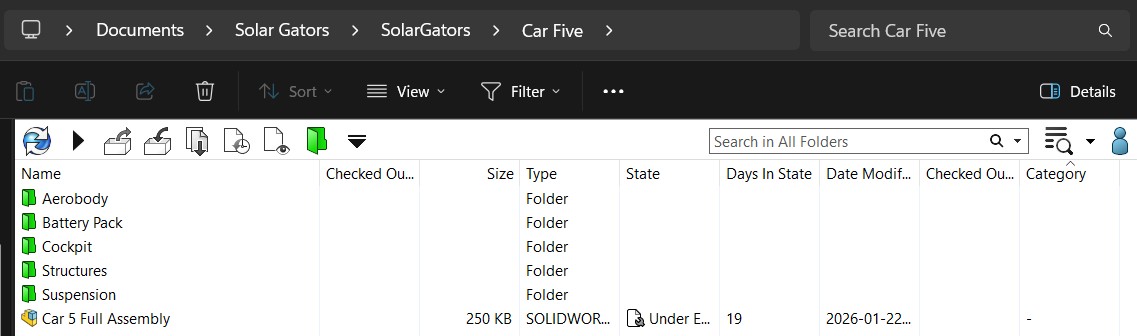 - FOLDERS: Aerobody, Battery Pack, Cockpit, Structures, Suspension