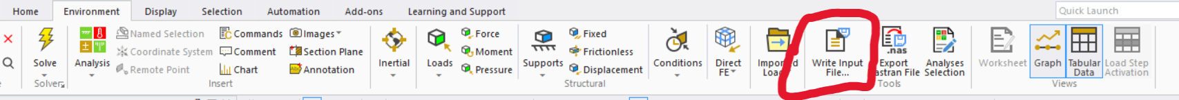 3. Go to the Environment tab in "Static Structural (C3)" or equivalent, and click on write input file. Save the input file as an ".inp" file :