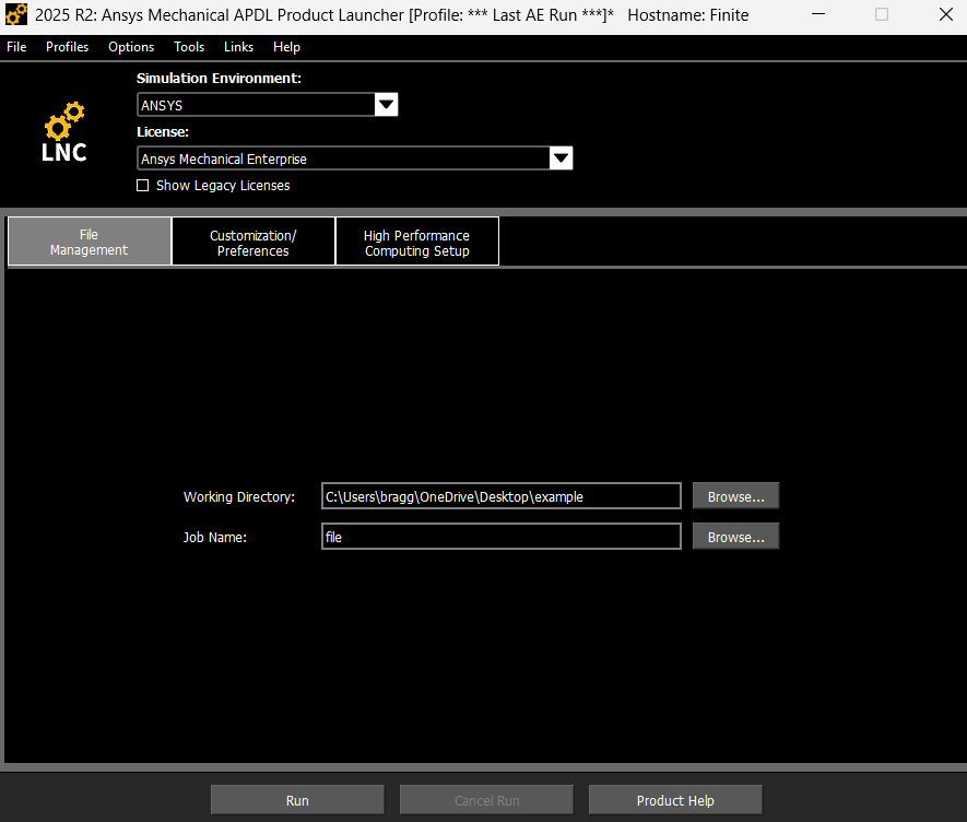 4. Open Ansys Mechanical APDL Product Laucher, choose your working directory, file name and run :