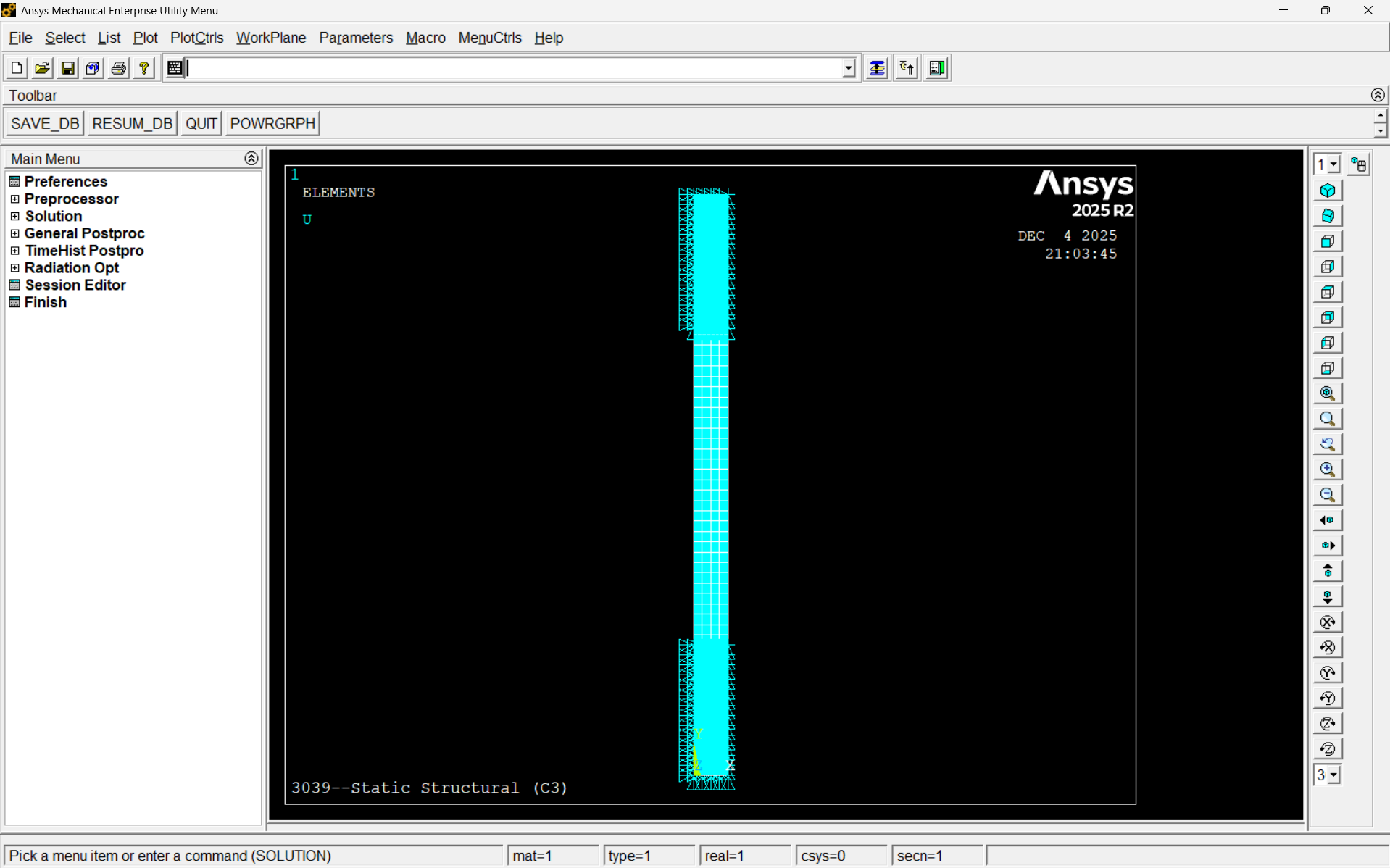 5. In Ansys APDL go to File>Read Input From ...> choose your input file, then type "EPLOT" in the command bar on the top. This will open your workbench simulation into ansys apdl, however there can be element, displacement, force, and node discrepancies between workbench to apdl (stuff workbench does not show you), so please check that everything is right using "DLIST, ELIST, NLIST, FLIST, SFLIST, SFELIST, and equivalent" - especially if you plan to script in apdl. APDL allow you to directly see how your model is operating using commands :